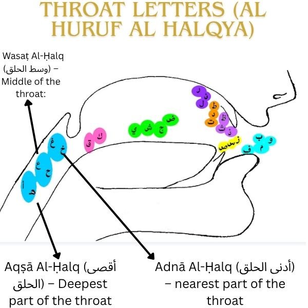 One of the most important rules in Tajweed is proper articulation. In Arabic, letters are pronounced from five primary articulation points or parts of the human vocal system known as “Makharij. One of them, known in Arabic as “Al-Halq” (الحلق), which means throat.